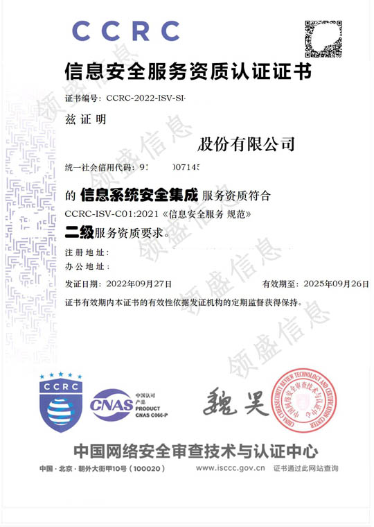 CCRC认证安全集成二级证书(信息安全服务资质认证证书)
