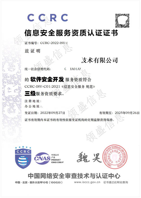 CCRC认证软件安全开发三级证书(信息安全服务资质认证证书)