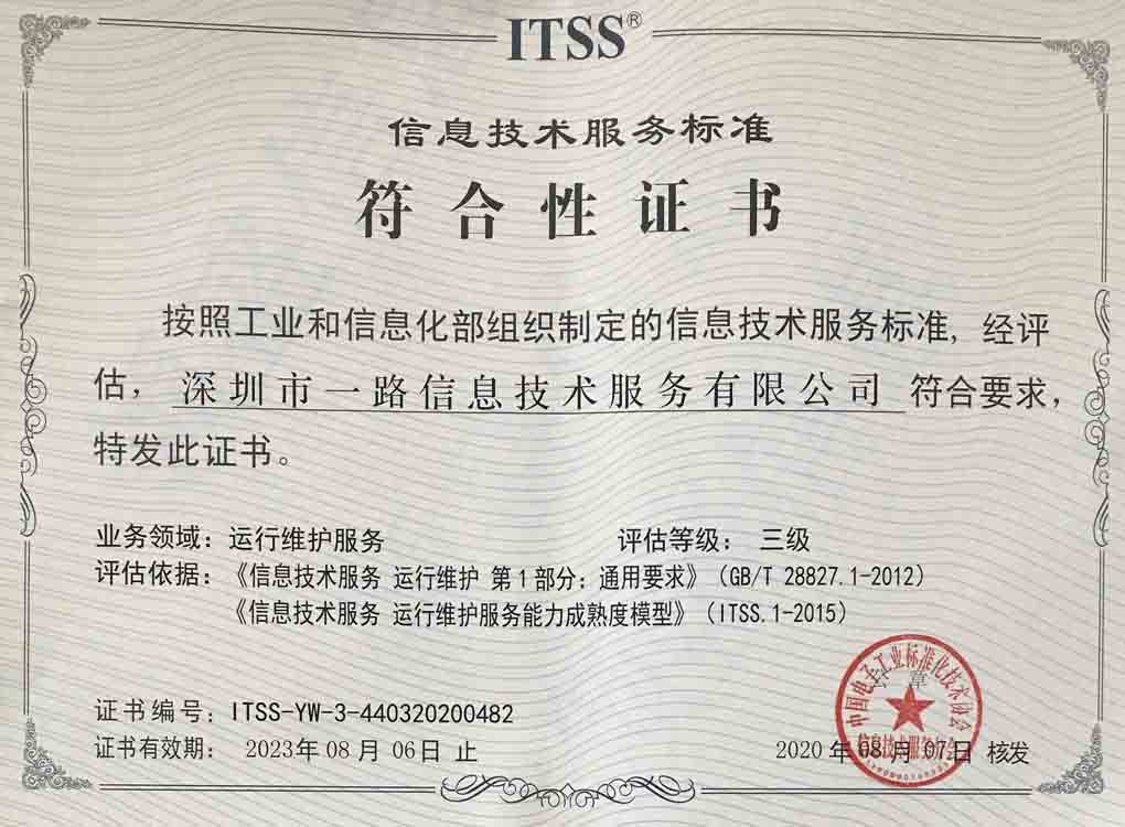 祝贺一路信息顺利通过ITSS认证三级(运行维护模型)