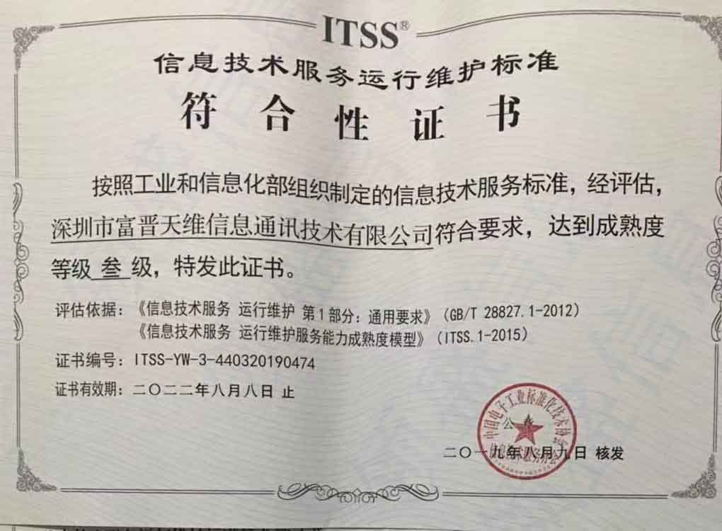 祝贺深圳市富晋天维信息通讯技术有限公司顺利通过ITSS认证三级(运行维护模型)