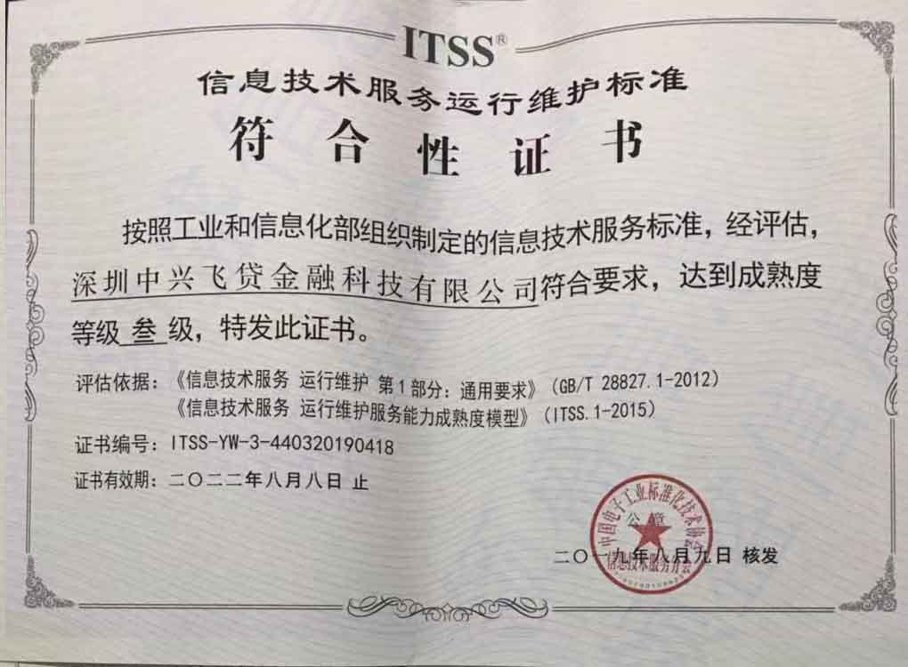 热烈祝贺深圳中兴飞贷金融科技有限公司顺利通过ITSS认证三级-运维模型!