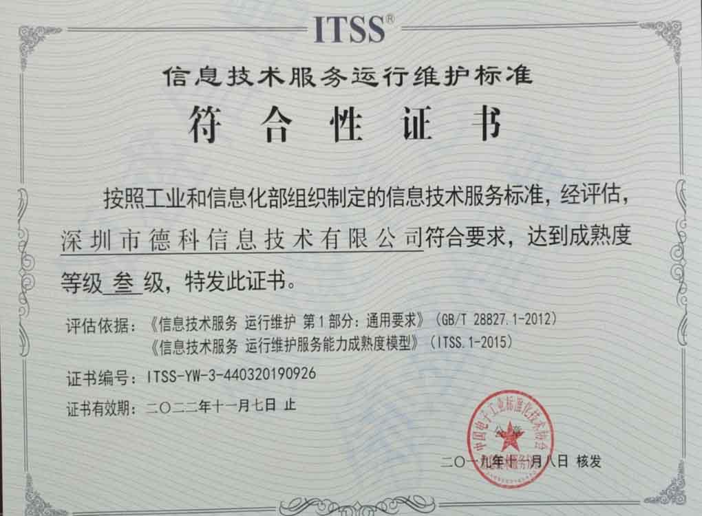 热烈祝贺深圳市德科信息技术有限公司顺利通过ITSS三级认证!